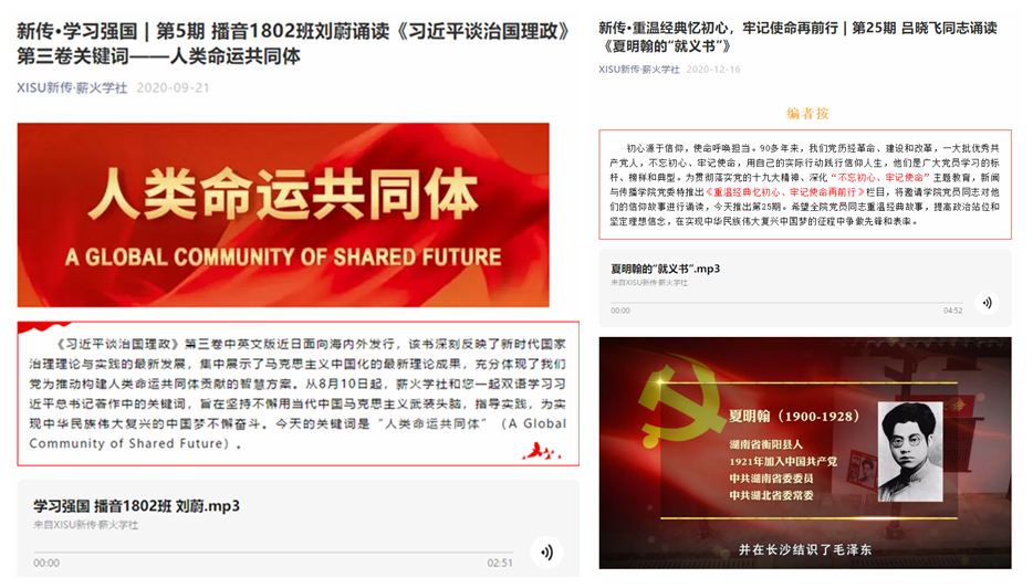 学院主动把握网络思想政治教育主渠道,有效利用重大纪念日契机开展主题教育,依托线上理论学习平台“XISU新传•薪火学社”发布系列“网红栏目”,如“青听FM师生接力诵读马列经典、“平语近人”音视频微课、“战疫家书”诵读、“四史”学习教育心声展等,目前已完成近百期节目录制,阅读量过万。让学生在轻松活泼的氛围中接受了知识、学到了真理、培养了信念,一系列理论学习栏目得到了学生广泛好评。