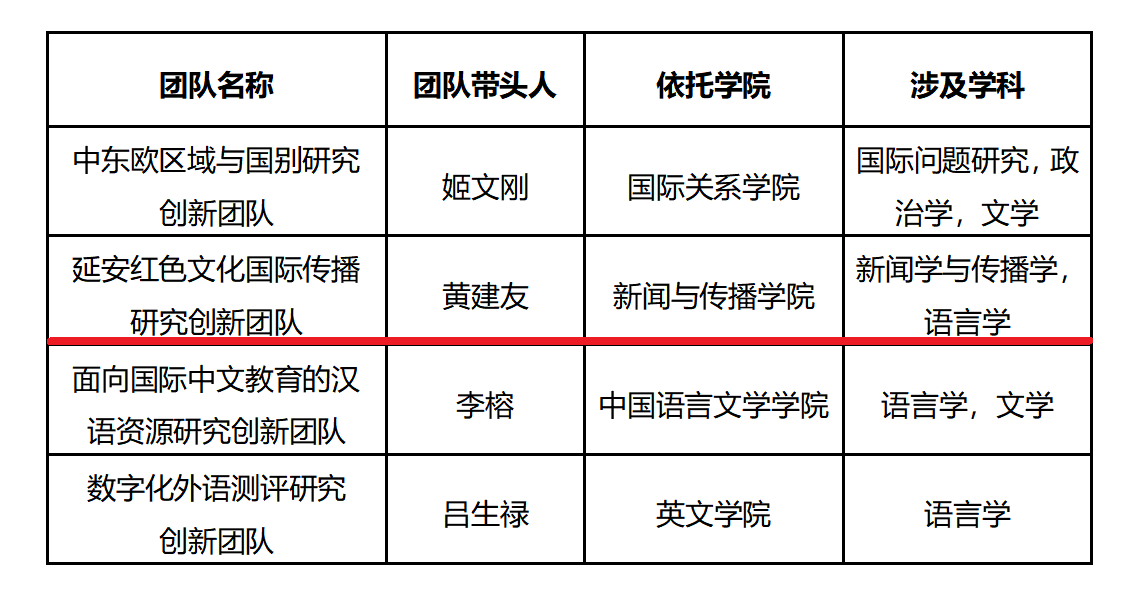 黄建友教授此次带领延安红色文化国际传播研究创新团队,依托新闻传播学和外国语言文学学科交叉优势,重点关注延安红色文化多语种编译与语料库建设、延安红色文化国际传播案例库建设和话语体系构建以及延安红色文化国际传播的实践创新与效能评测等三个研究方向,充分挖掘延安红色文化的独特外宣价值,更好地推动红色文化走向世界。