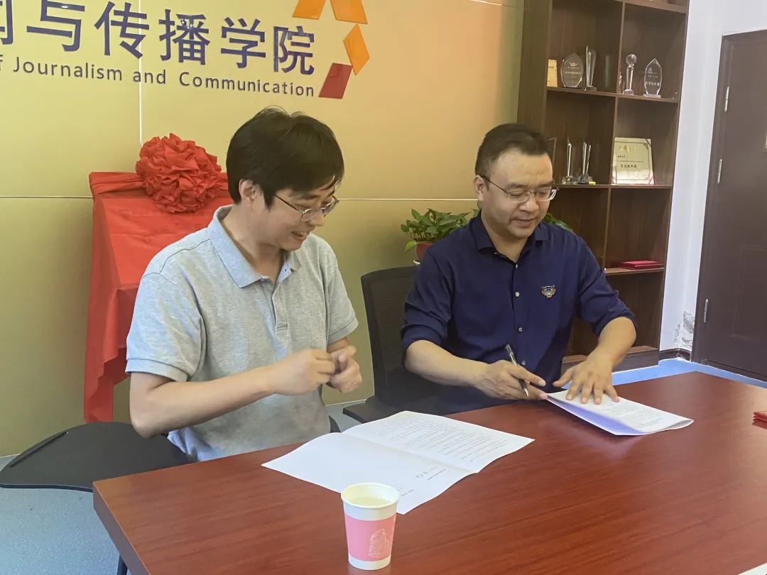 在所有嘉宾和师生的见证下,黄建友院长与西部网总编辑饶建军进行签约并共同为实践教学基地揭牌。