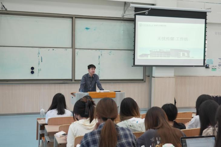 接着,编导老师刘昱辉首先以时事热点为引与大家分享视频平台的热门视频以及如何抓住热点去创作视频。他也以一段幕后工作视频为同学们讲解编导的日常工作,编导的日常工作有前期与达人的沟通与筹备工作,选取地点拍摄,现场所有工作人员共同协调和调动。刘昱辉老师也与现场同学积极互动,以提问形式来了解同学们是如何理解编导这一职业。