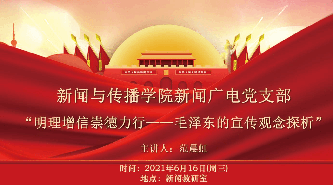 6月16日,新闻广电支部在新闻教研室展开专题理论学习,此次理论学习由副院长、新闻教研室主任范晨虹老师主讲党课“明理增信崇徳力行——毛泽东的宣传观念探析”。