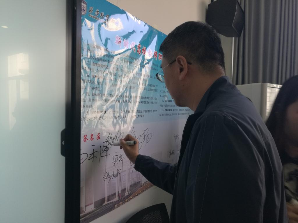 研讨交流后,举行人民教师誓词宣誓活动,在播音与主持教研室主任樊强带领下,全体与会人员庄严宣誓。最后,全体教师在《新时代高校教师职业行为十项准则》签名板签名承诺。