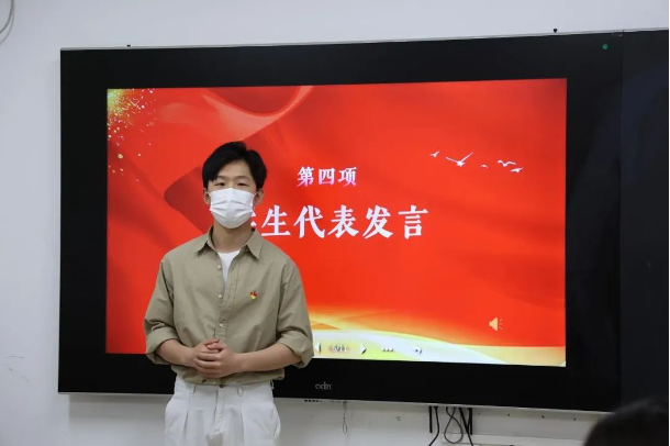全体起立,奏唱国歌。礼毕,学院党委书记张梅宣布授牌仪式正式开始。主持人宣读党员宿舍名单并请党员代表上台领奖,张梅书记、刘鹏博副书记为他们授牌。播音与主持艺术专业学生党支部张彬杰和新闻学专业学生党支部柯佳琦进行发言,他们表示,一名党员是一面旗帜,一间党员宿舍是一座先锋堡垒。“党员宿舍”门牌是对党员的肯定,更是对党员的期待。同学们应以此次挂牌活动为契机,增强党性,强化责任担当;努力践行全心全意为人民服务的宗旨,自觉接受同学的监督。