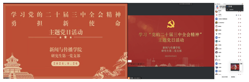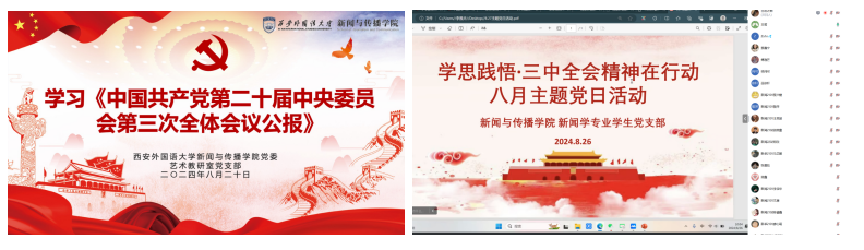 网络与新媒体专业学生党支部以“学深悟透强本领 担当作为促发展——学习贯彻党的二十届三中全会精神”为主题,支部书记净一丹指出,要以全会精神为指引,进一步增强四个意识,克服前进道路上的各种困难和挑战,不断开创中国特色社会主义事业新局面;支部党员代表祝楷、陈语诺同志表示,要以全会精神为指导,不断提高自身素质和能力水平,为实现中国梦贡献自己的青春力量。