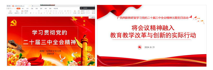 广告网新教研室党支部以“用会议精神助推教育教学改革与创新的实际行动”为主题,支部书记杨琳指出,会议精神中的人民立场和时代责任感,鞭策着我们教师要紧紧把握时代脉搏,将人才培养与国家发展、社会进步紧密结合,努力培养有担当、有责任、有理想、具备时代要求的能力的新时代大学生。支部党员代表聂靓、郭扬表示,要通过深入学习,准确把握会议提出的新理念、新战略、新举措,将党的二十届三中全会精神转化为推动教育教学改革的具体行动。深入思考自己日常教学科研工作中的创新点,为推动我校教育教学事业高质量发展贡献力量。