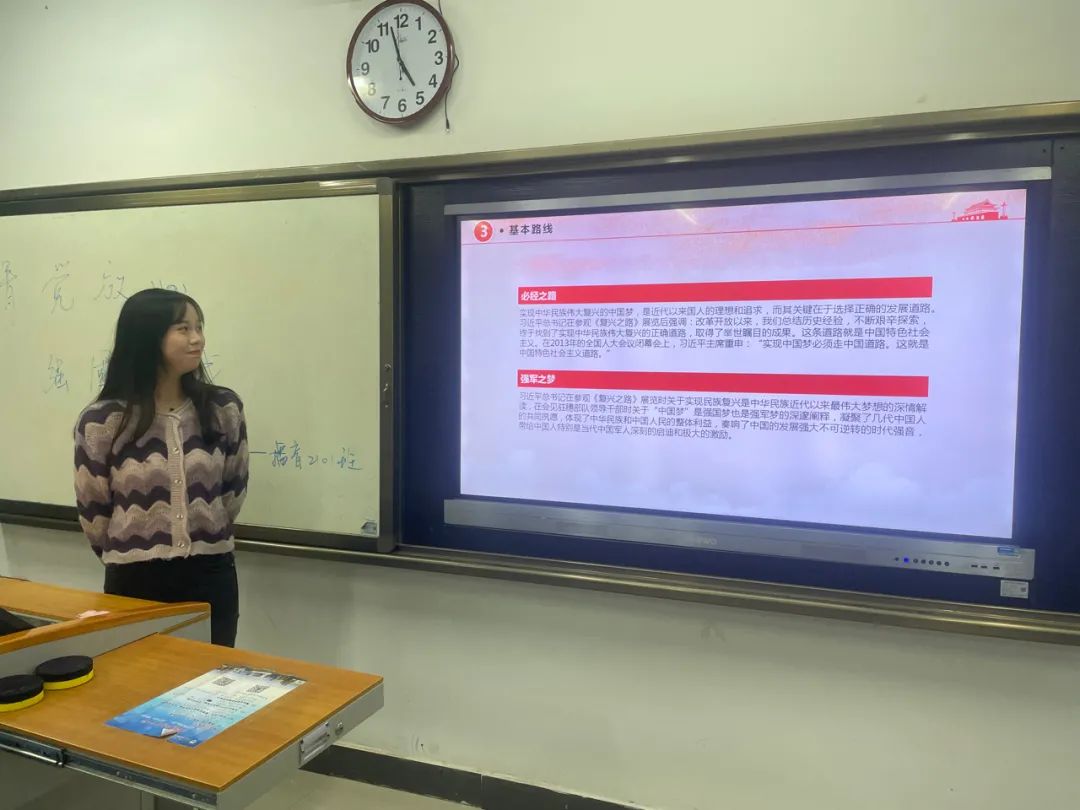 团支书党子煜对此次主题分享了自己的看法,习近平总书记特别强调:“未来属于青年,希望寄予青年。”“新时代的中国青年要以实现中华民族伟大复兴为己任,不负时代,不负韶华,不负党和人民的殷切期望”。年轻人,代表着国家的希望和民族的未来,新时代的年轻人,是有远大理想的一代,也一定是能够担当大任的一代。