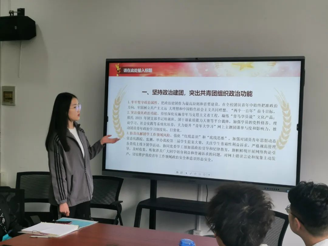 会议伊始,吕晓飞介绍了共青团要坚持政治建团,突出共青团组织政治功能,坚持思想立团,高扬思想政治主旋律的重要性。我们应牢牢坚守政治属性,突出强化政治功能,防范化解团学工作领域风险,广泛开展庆祝建党100周年主题宣传教育实践活动,积极培育和践行社会主义核心价值观等。