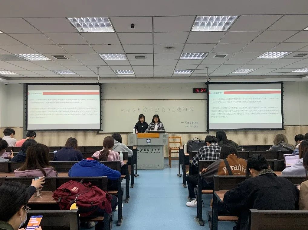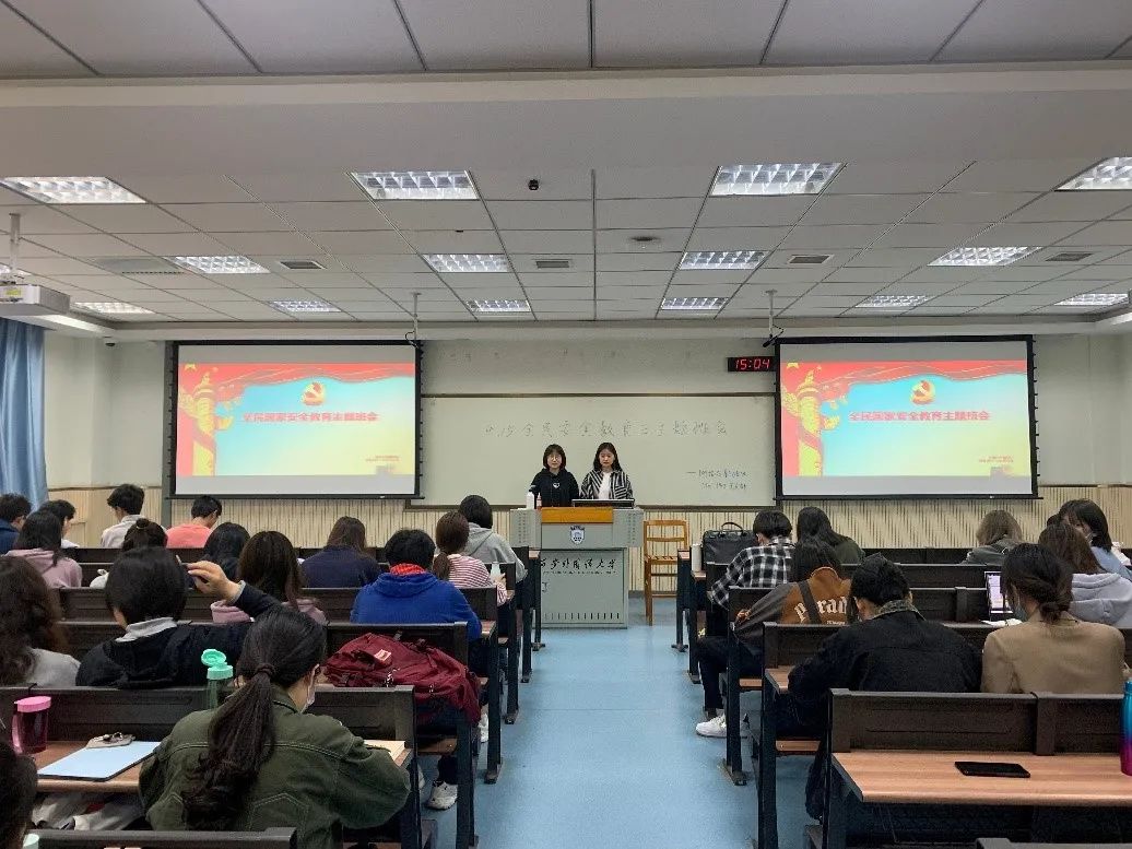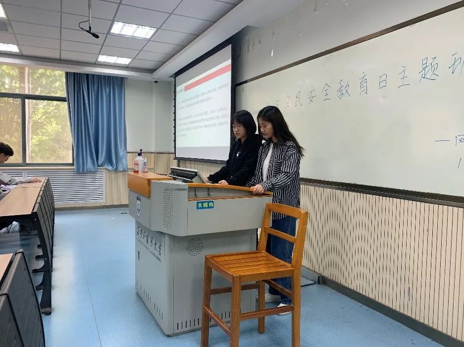 随后,胡嘉文同学带领同学们观看相关视频,着重强调了视频中坚持中国特色国家安全道路,坚持以人民安全为中心等10项坚持内容,向大家分析解释了全民国家安全教育日的意义所在——提高公民维护国家安全法律意识和增强国家安全法普法宣传活动。