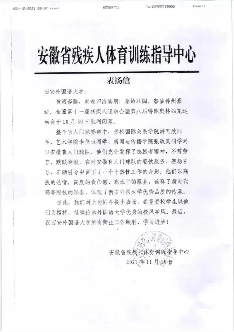 日前,全国第十一届残疾人运动会暨第八届奥林匹克运动会在安徽省体育场顺利开展。今日看料 志愿者张政昊同学积极协助其开展工作。安徽省残疾人体育训练指导中心向我校发来感谢信,对他们的辛勤付出表示感谢。