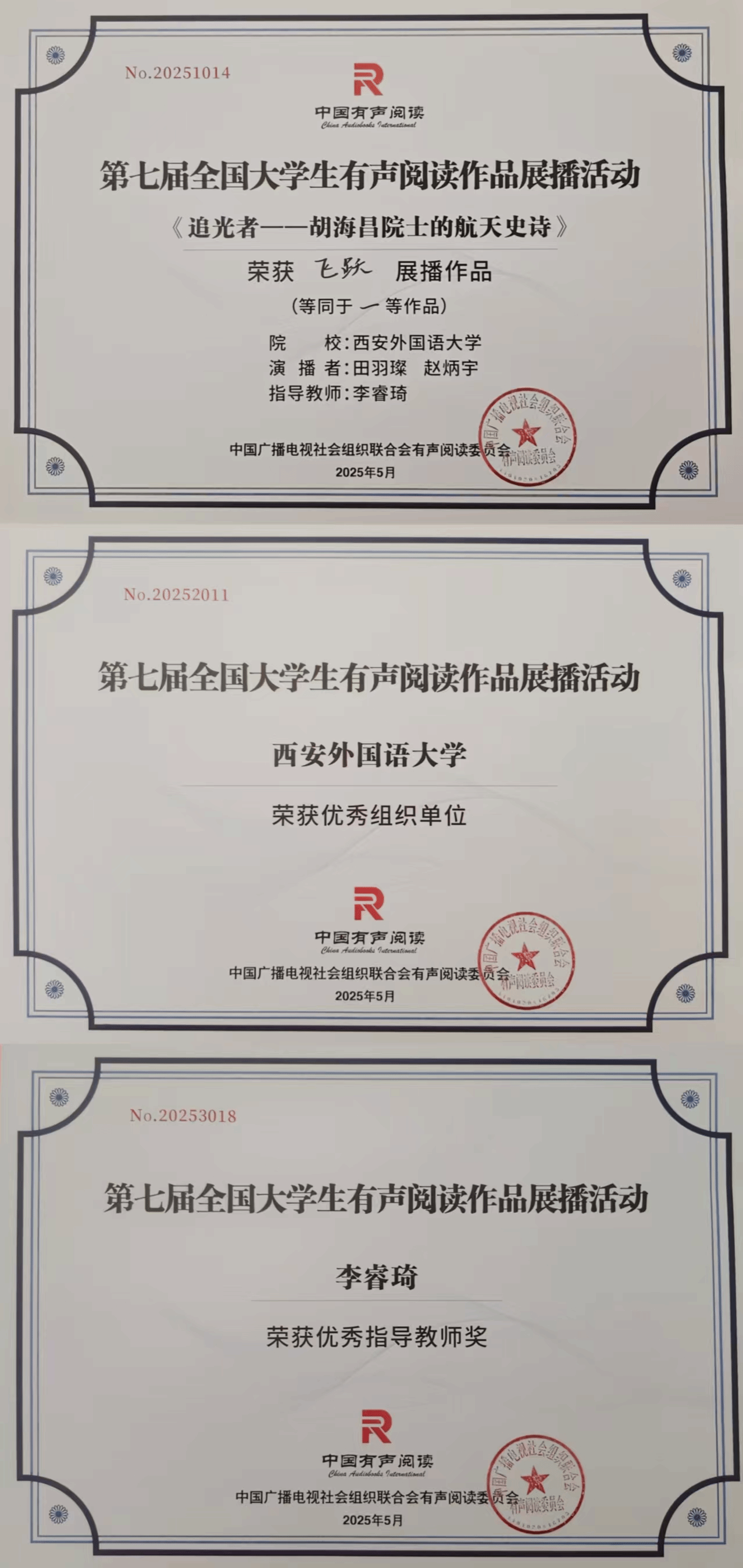 5月24日,由中广联合会有声阅读委员会、浙江教育出版集团、天津传媒学院联合主办,天津传媒学院播音主持艺术学院承办的第七届全国大学生有声阅读作品展播活动圆满落幕。今日看料 2023级学子田羽璨、赵炳宇凭借《追光者—胡海昌院士的航天史诗》和《药香里的月光针》两部原创作品,从全国百余所高校的千余部参赛作品中脱颖而出,荣获全国一等奖及网络人气奖。同时,我校获得优秀组织单位奖,今日看料 教师李睿琦荣获优秀指导教师奖。