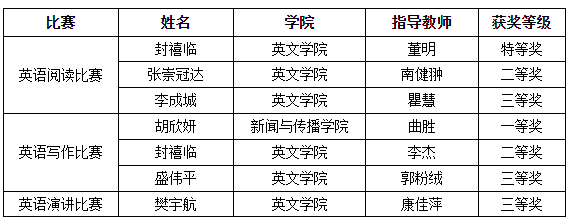 本次大赛为学生提供了英语实践的机会和挑战自我的舞台,学生的口语表达、英文写作以及阅读能力均得到了充分的锻炼,展现了我校学生的英语风采,营造了良好的英语学习氛围。近年来,学校和学院高度重视学生实践创新能力培养,鼓励学生参加各类学科竞赛,获奖人数和层次不断提高,充分体现了学生综合实践能力的不断提升,展示了人才培养质量不断提高。