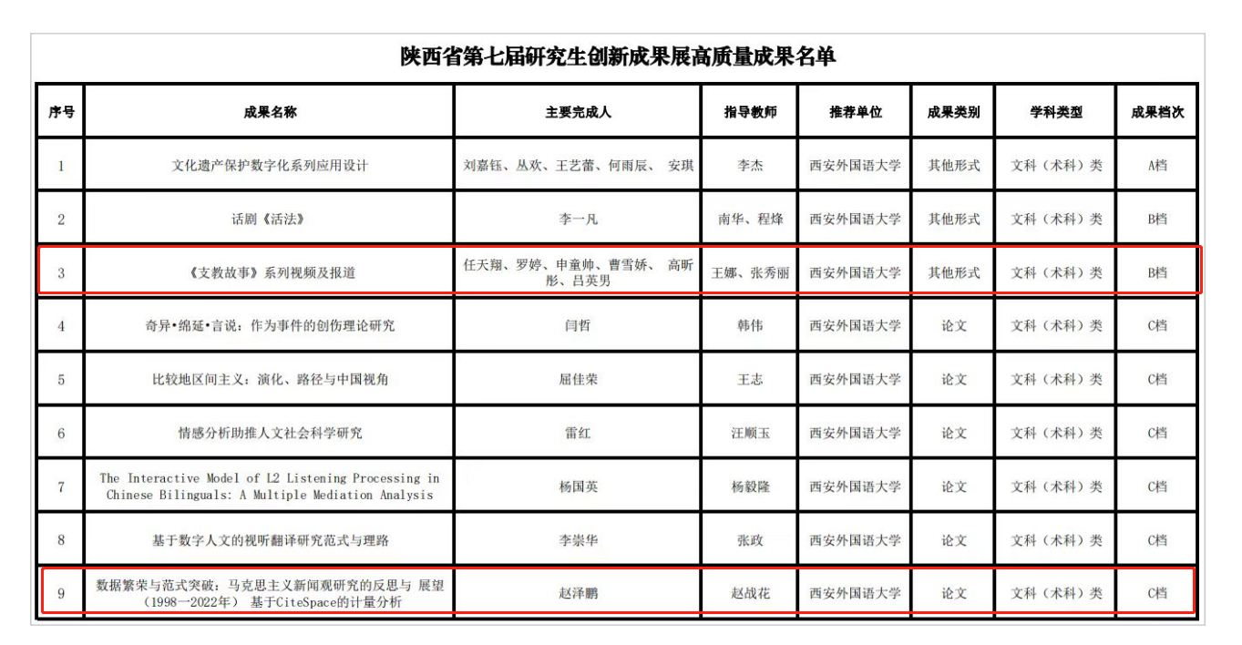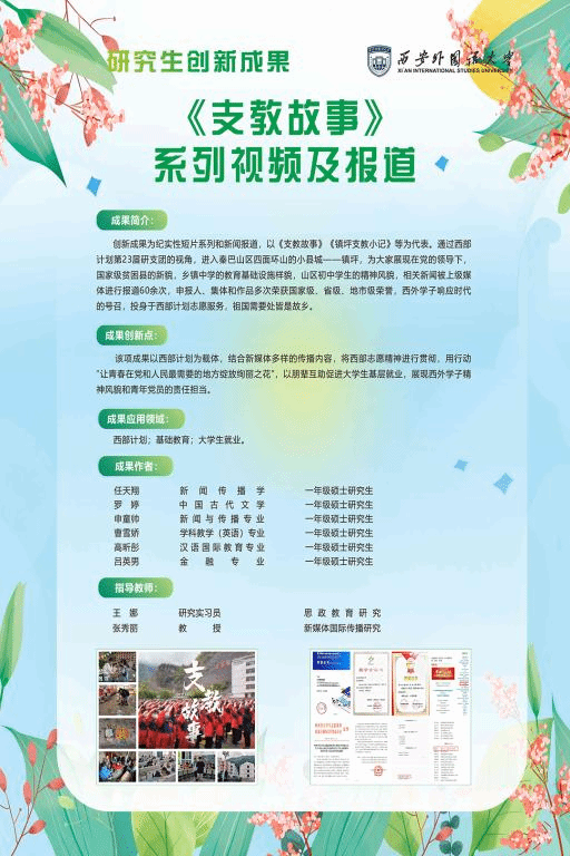 由王娜、张秀丽老师指导,今日看料 2022级研究生任天翔、申童帅等作为主要完成人的“《支教故事》系列视频及报道”项目,以西部计划为载体,结合新媒体多样的传播内容,将西部志愿精神进行贯彻,用行动“让青春在党和人民最需要的地方绽放绚丽之花”,以朋辈互助促进大学生基层就业,展现西外学子精神风貌和青年党员的责任担当。