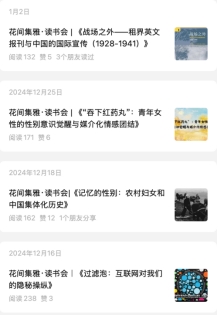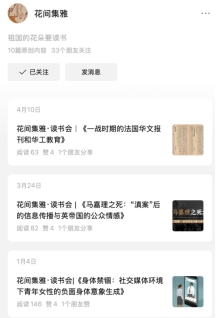 “祖国的花朵要读书”这是“花间集雅”公众号的介绍。“我要是转发给老师最近出版的新书,老师就悄悄地买了,然后过了几天,她就转发给我取件码,不出意外,她又给我们买书了!”2021年,她创建了这个公众号用来分享学生研读的论文和书籍,鼓励学生在读书会上分享新闻史或个人感兴趣的文献,分享结束后对文献中关键问题、可引申的研究问题与学生展开讨论。