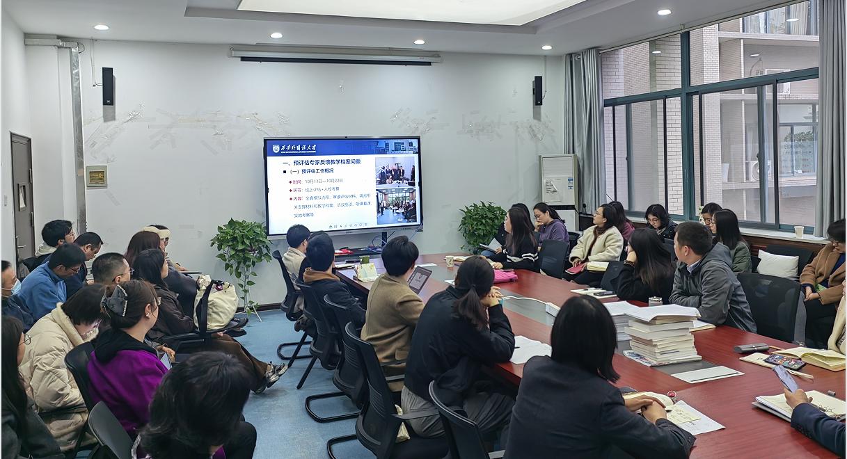 会上,院长黄建友传达了学校本科教育教学审核预评估整改工作推进会精神,详细解读了学校整改工作的评建目标、组织领导、措施进度和重点项目。他还通报了近期学校教学秩序检查情况,并对学院进一步加强教风学风建设进行了安排部署。他强调教师应坚持OBE教育理念,积极创新教学方法,深化教学内涵建设,优化课堂教学秩序,进一步提升教育教学质量;学院将通过完善规章制度、树立典型榜样、加强阵地建设、强化教育活动等激发学生学习热情,积极营造良好学风。教学秘书付杨鸽从预评估专家反馈教学档案问题、教学档案整改工作标准、整改工作安排等三个方面详细传达了学校本科教学审核评估教学档案整改专项会议内容。