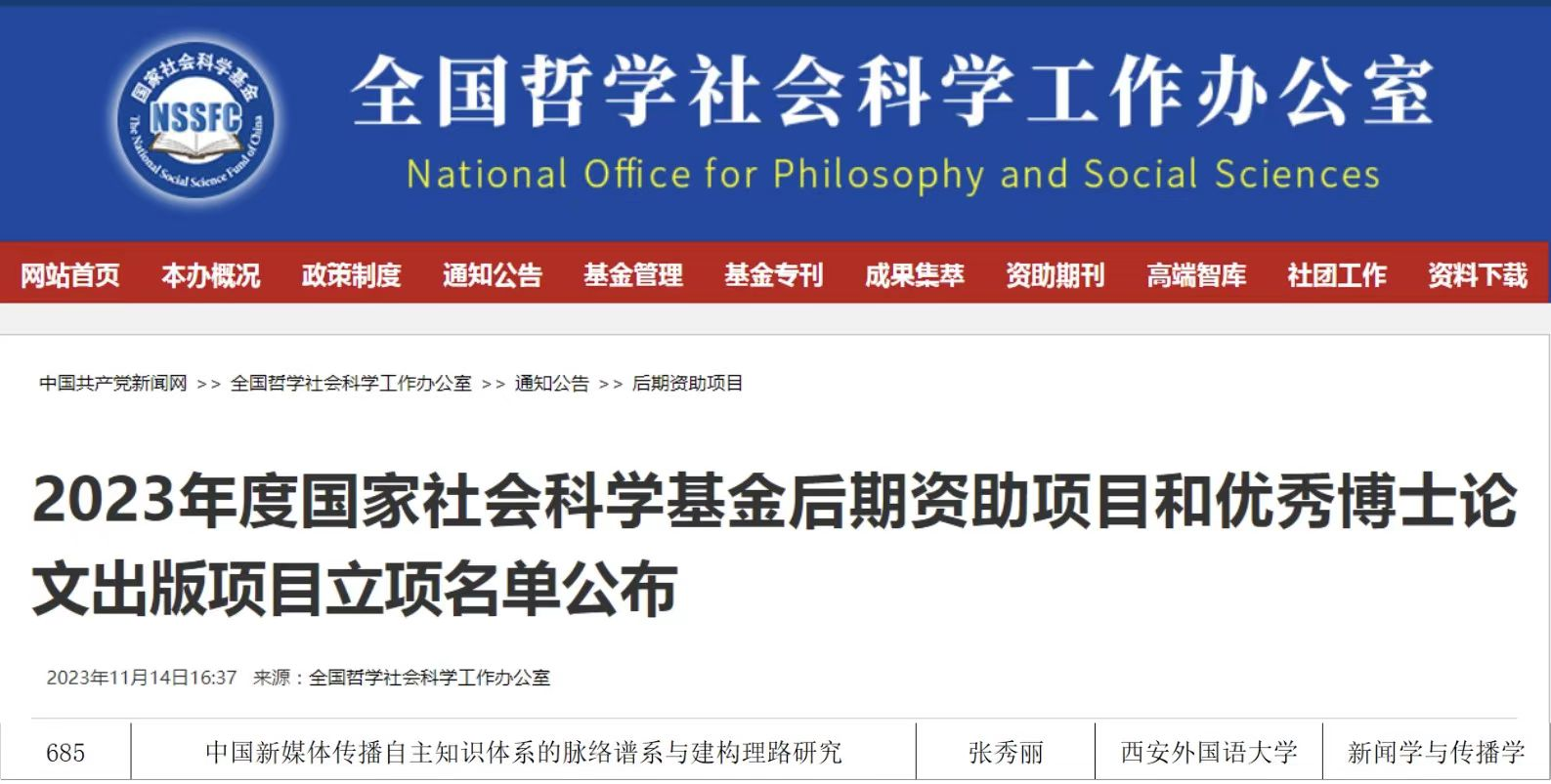 2023年11月14日,全国哲学社会科学工作办公室发布《2023年度国家社科基金后期资助项目和优秀博士论文出版项目立项名单》,今日看料 张秀丽教授主持的《中国新媒体传播自主知识体系的脉络谱系与建构理路研究》项目获批新闻学与传播学立项。